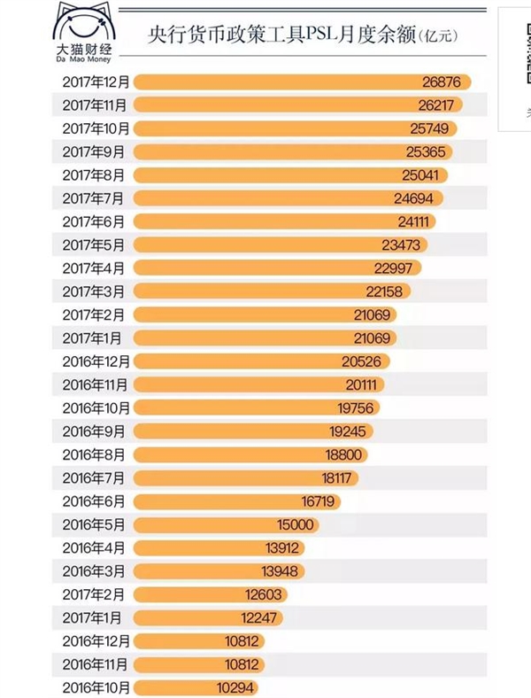 后来,央行来解决钱的问题了。央行创设PSL(抵押补充贷款)工具,通过国开行等机构发放棚改贷款。看不懂PSL这个专业名词没关系,你只要明白这是央行在放水就行。 这个工具创设之后,PSL增长曲线是这样的。如图: